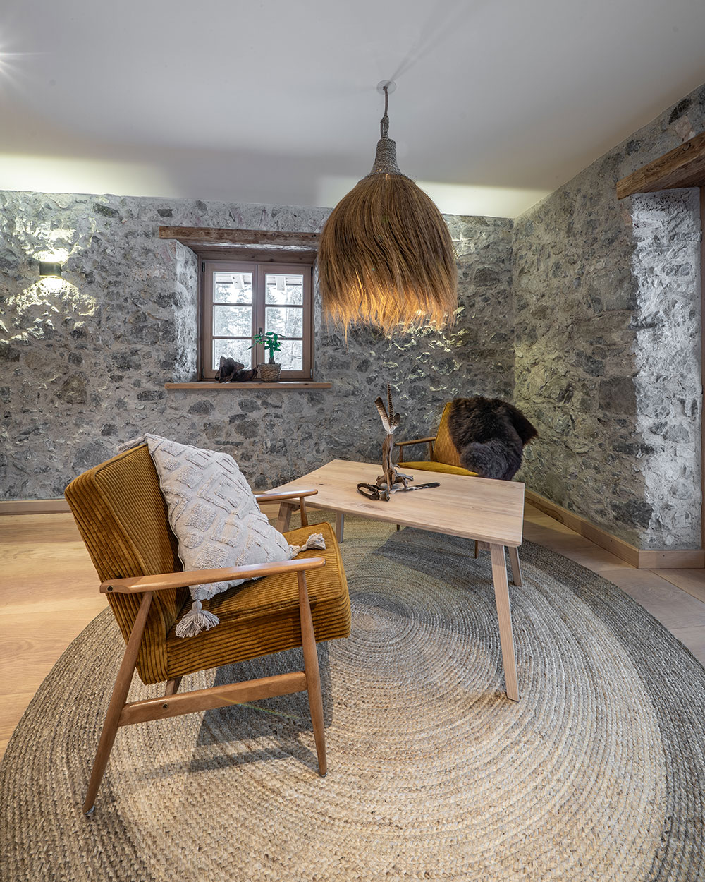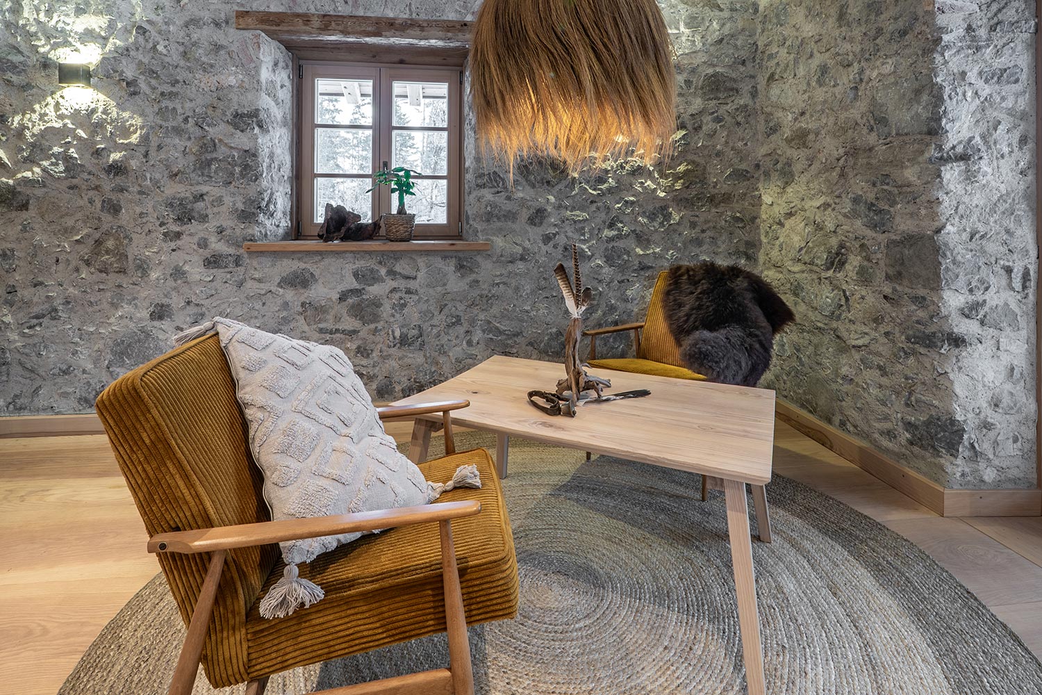 Die Ferienwohnung verbindet natürliche Materialien wie Holz, Stein und Jute mit einem leichten Boho-Stil. Allergikerfreundlich ausgestattet, entsteht eine ruhige, warme Atmosphäre – bewusst reduziert, nachhaltig gestaltet und fernab von überladenem Alpenkitsch für ein entspanntes Wohngefühl.